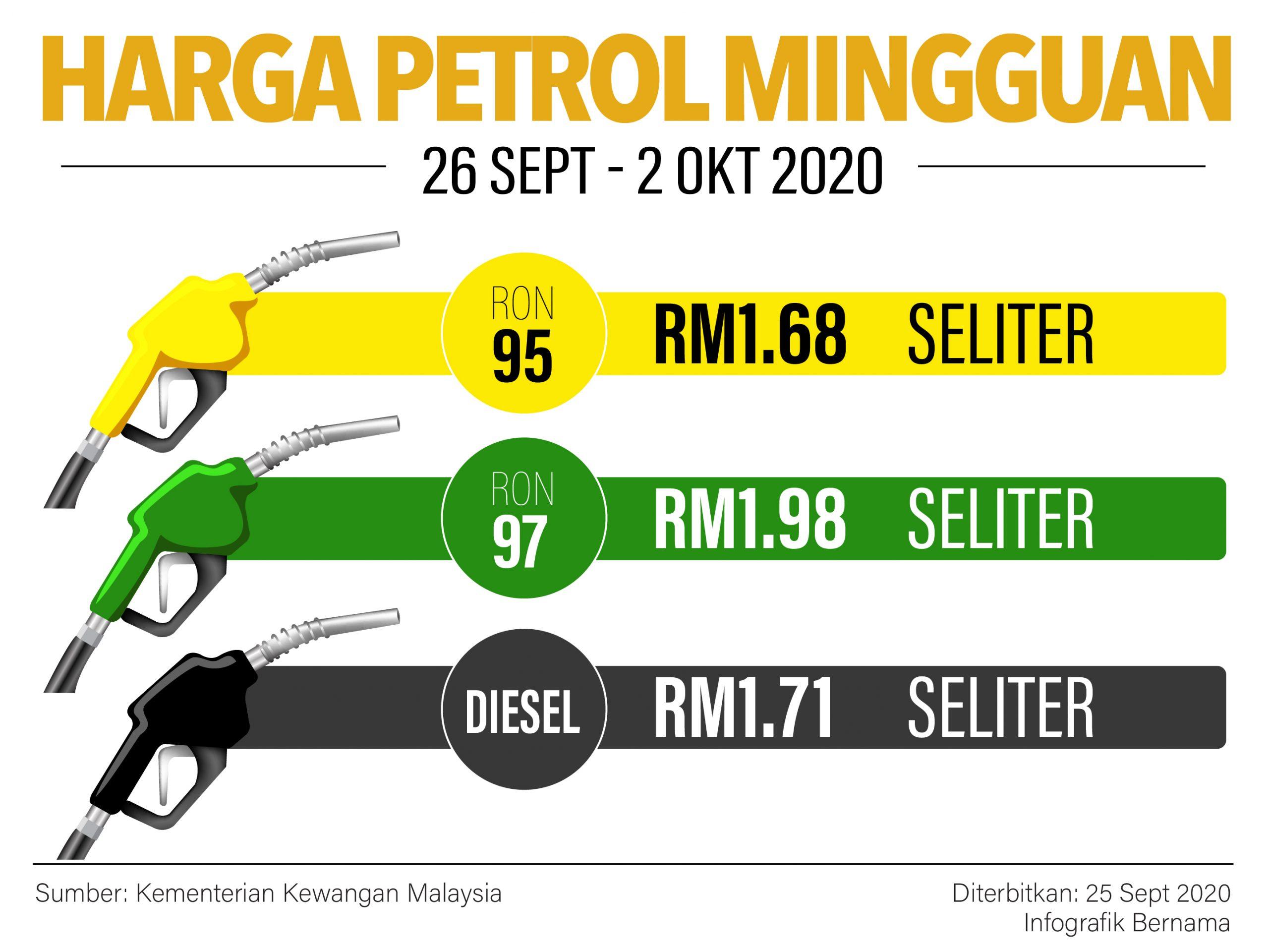 Kementerian kewangan dalam kenyataan berkata, berdasarkan penetapan harga runcit mingguan produk petroleum menggunakan formula Mekanisme Harga Automatik (APM), harga baharu seliter bagi RON95 adalah RM1.68, RON97 (RM1.98) dan diesel (RM1.71).
