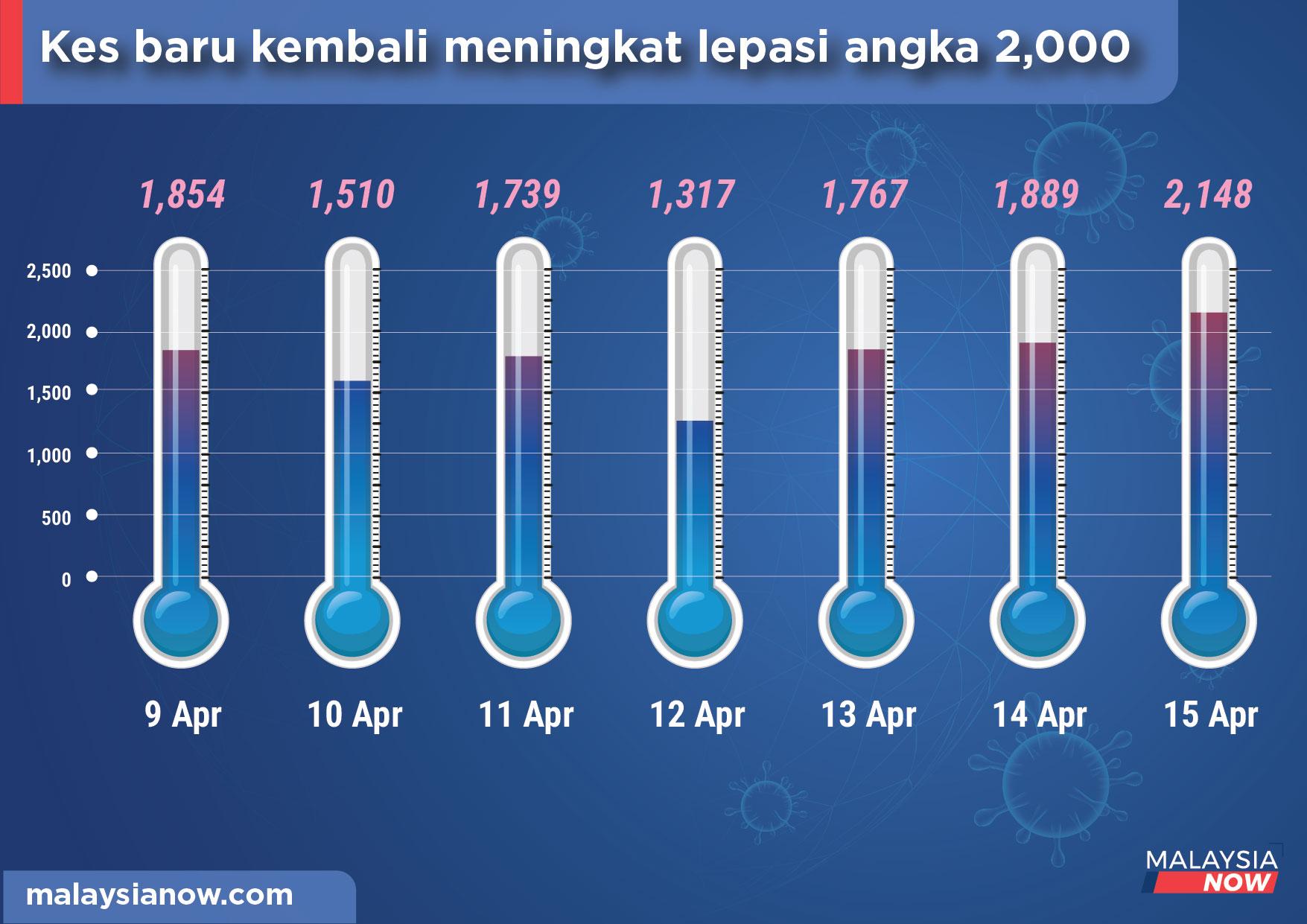 Semalam, kes jangkitan kembali meningkat melepasi angka 2,000 sebanyak 2,148 bagi kali pertama sejak 5 Mac selepas trend penurunan kes dicatatkan dalam negara.