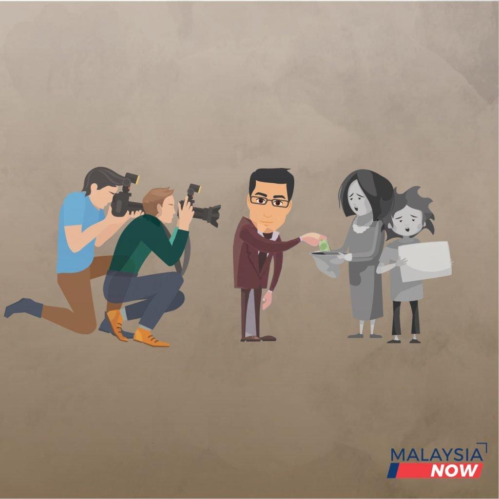 Pemandangan yang biasa kita lihat dalam media sosial: ahli-ahli politik dan tokoh masyarakat menandatangan dan menyerahkan derma kepada golongan miskin lebih-lebih lagi ketika tempoh bencana seperti banjir di pantai timur dan ketika pandemik Covid-19 menyerang ekonomi.