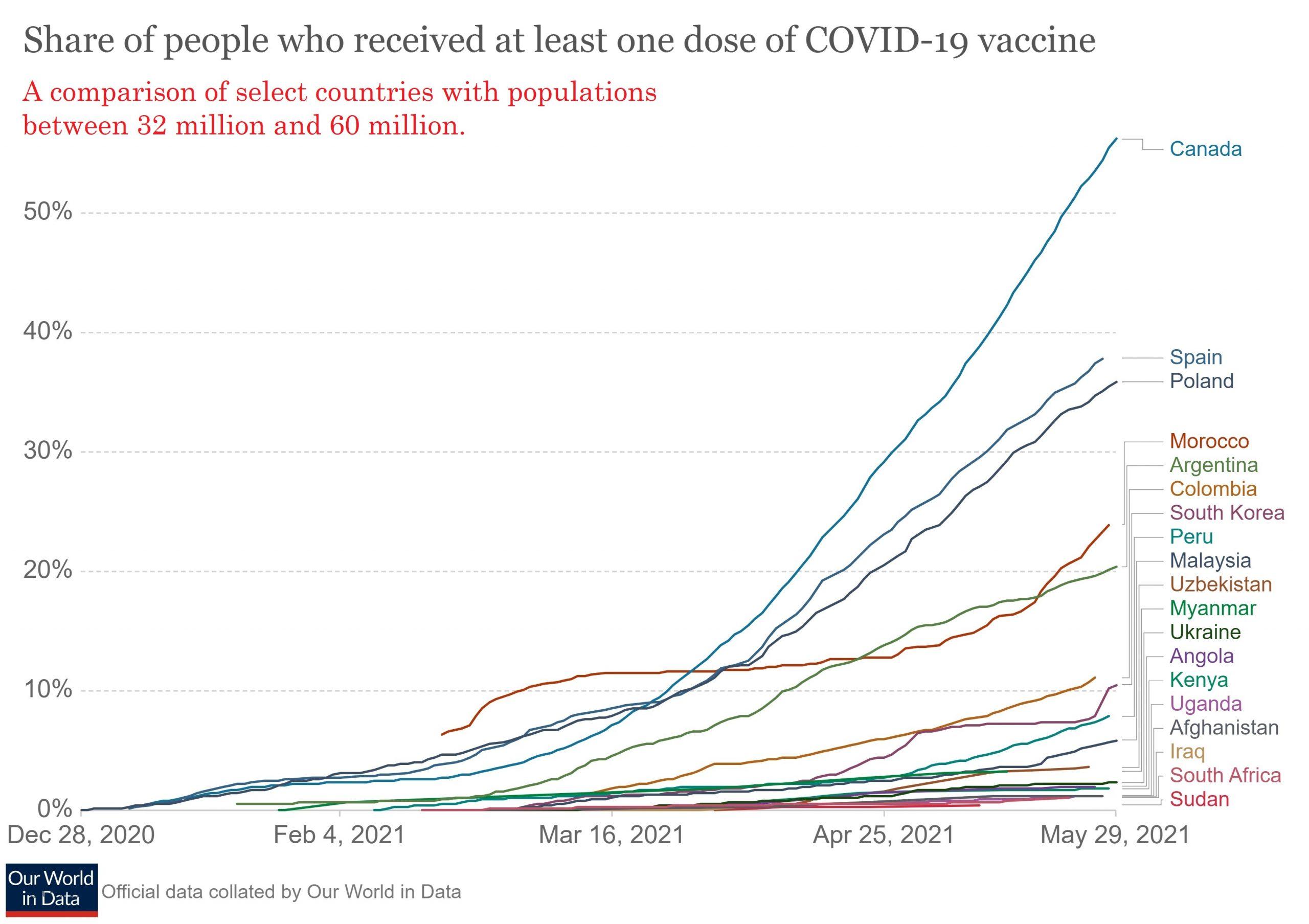 Data daripada senarai 20 negara dengan populasi antara 32 juta hingga 60 juta meletakkan Malaysia dalam kalangan negara yang mempunyai peratusan tinggi menjalankan vaksinasi sekurang-kurangnya bagi dos pertama vaksin.