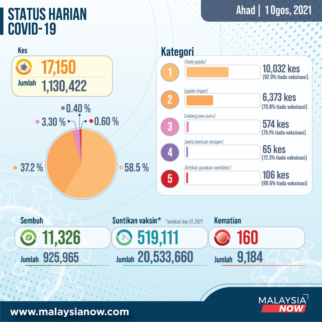 Sejumlah 17,150 kes Covid-19 direkodkan hari ini, menjadikan jumlah kes keseluruhan mencecah 1,130,422.