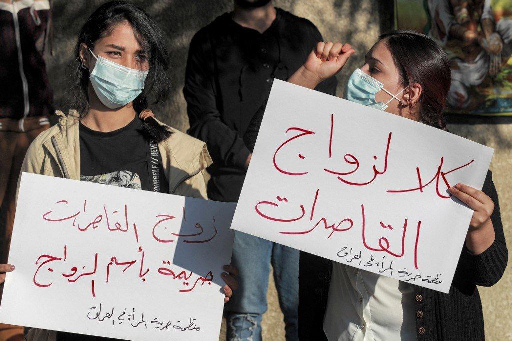 Aktivis hak asasi manusia di Iraq membantah dengan membawa sepanduk menyatakan 'perkahwinan kanak-kanak bawah umur adalah jenayah'.
