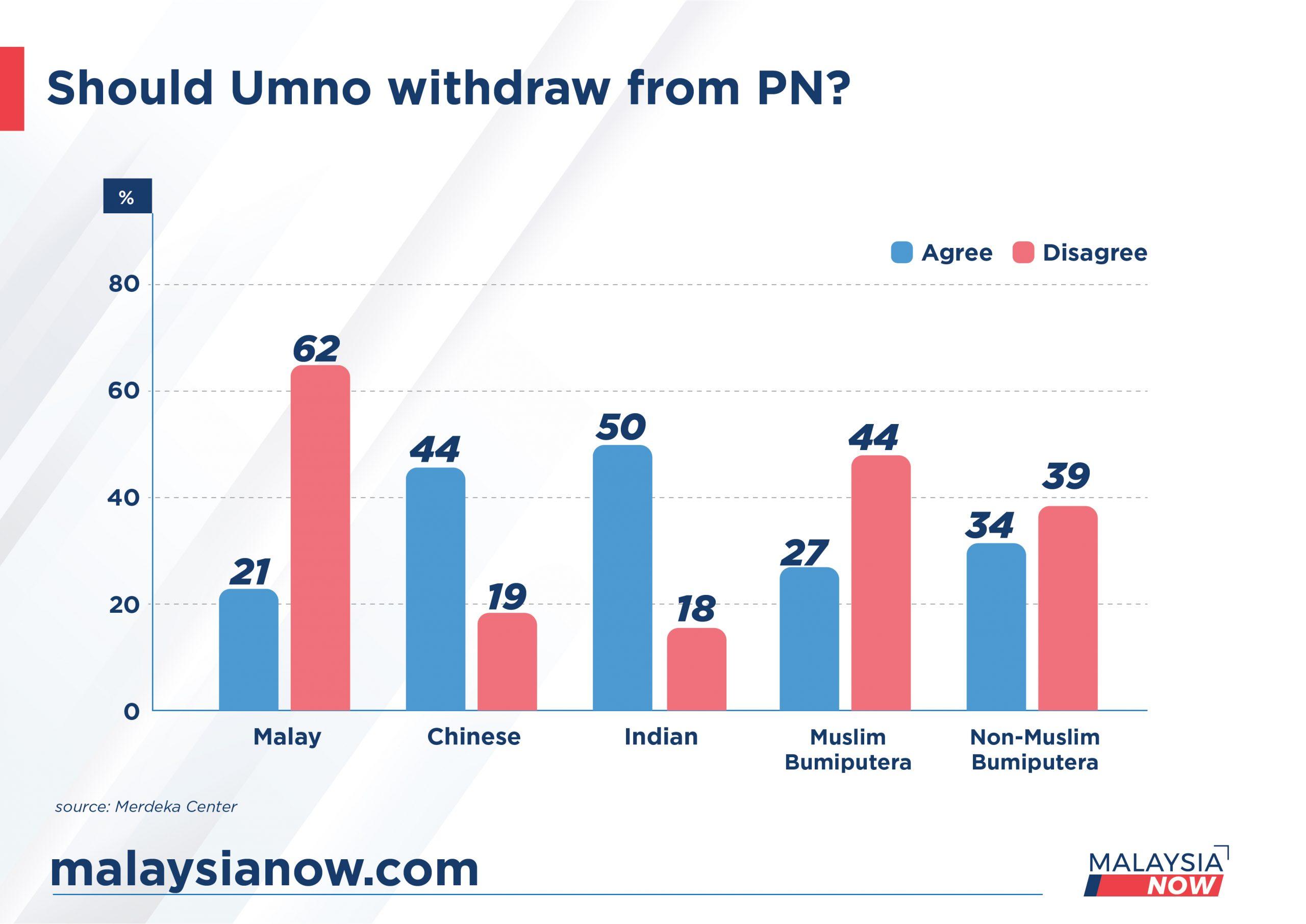 The survey, carried out by independent pollster Merdeka Center from Dec 23 to 31, found that 62% of Malay respondents disagreed with a withdrawal by Umno from PN while only 21% agreed.