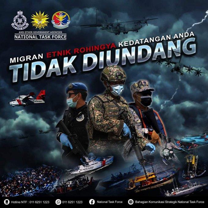 The caption of the poster reads: “Migran etnik Rohingya, kedatangan anda tidak diundangi” (Rohingya migrants, your arrival is not lawful).