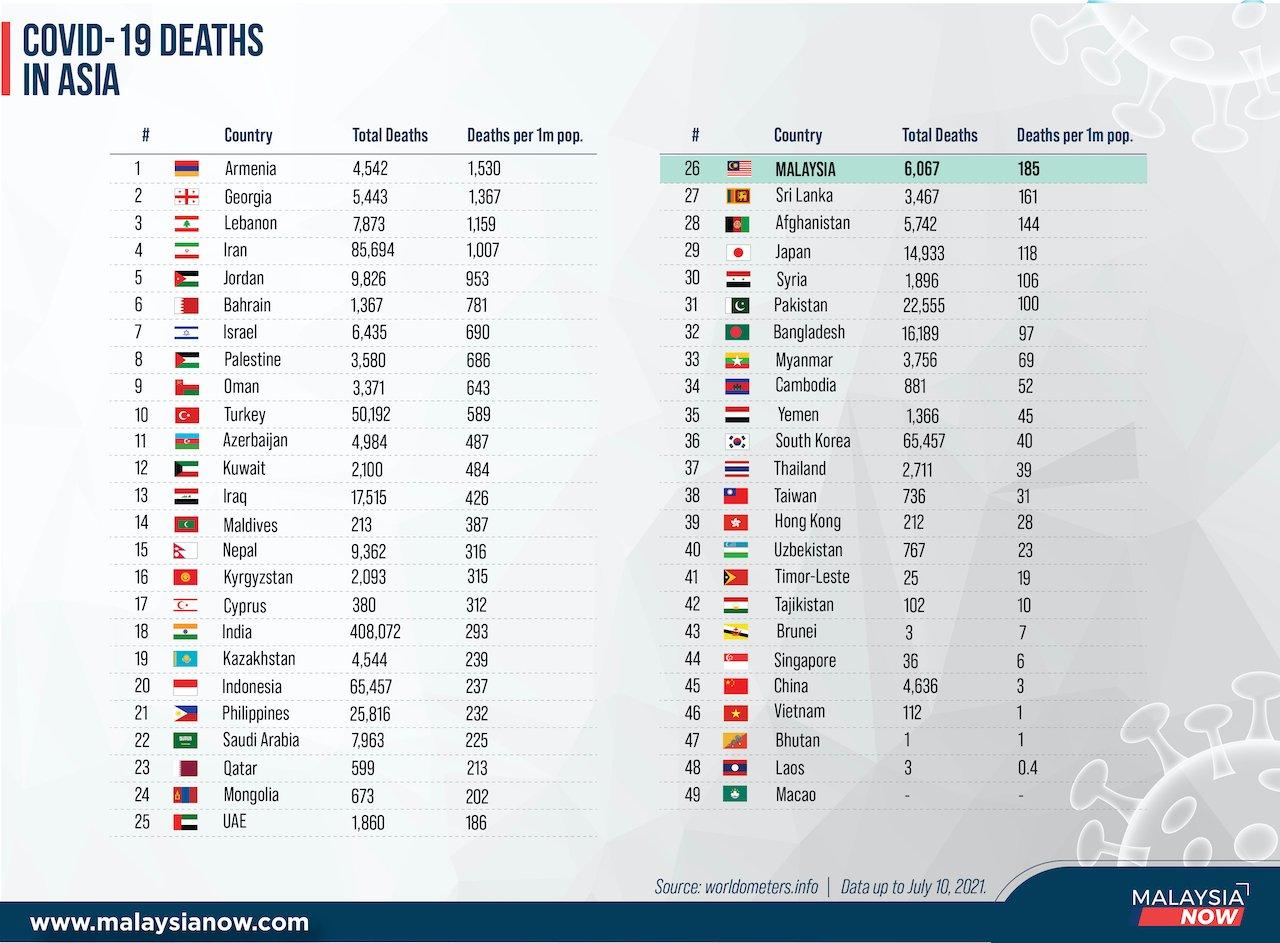 Malaysia sits somewhere in the middle of a list of Asian countries ranked according to the number of deaths proportionate to their populations despite the recent surge in casualties from Covid-19 which has taken more than 6,000 lives in the country so far.