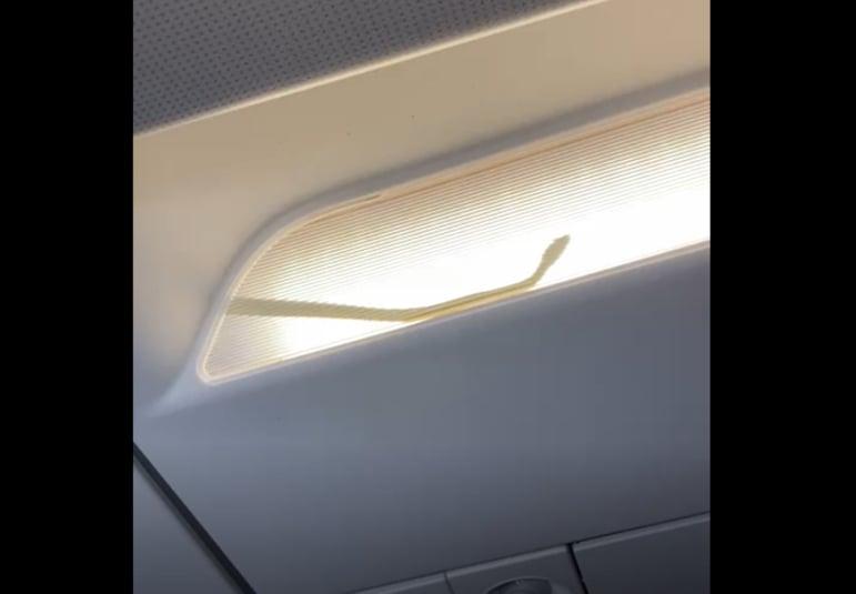 A video showing the reptile moving inside the overhead light panel on the plane has since gone viral on social media.