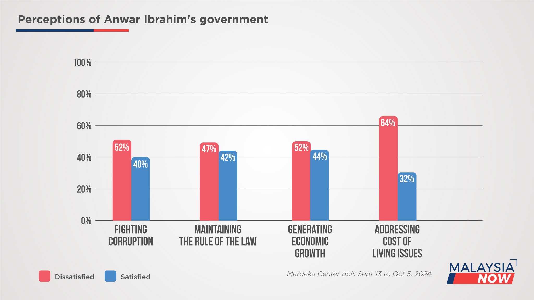 Overall, the findings show that Malaysians are still divided on the government's performance - 51% are satisfied and 47% are dissatisfied - a sign that two years of campaigning and sloganeering to promote the Madani issue has yet to bear fruit.