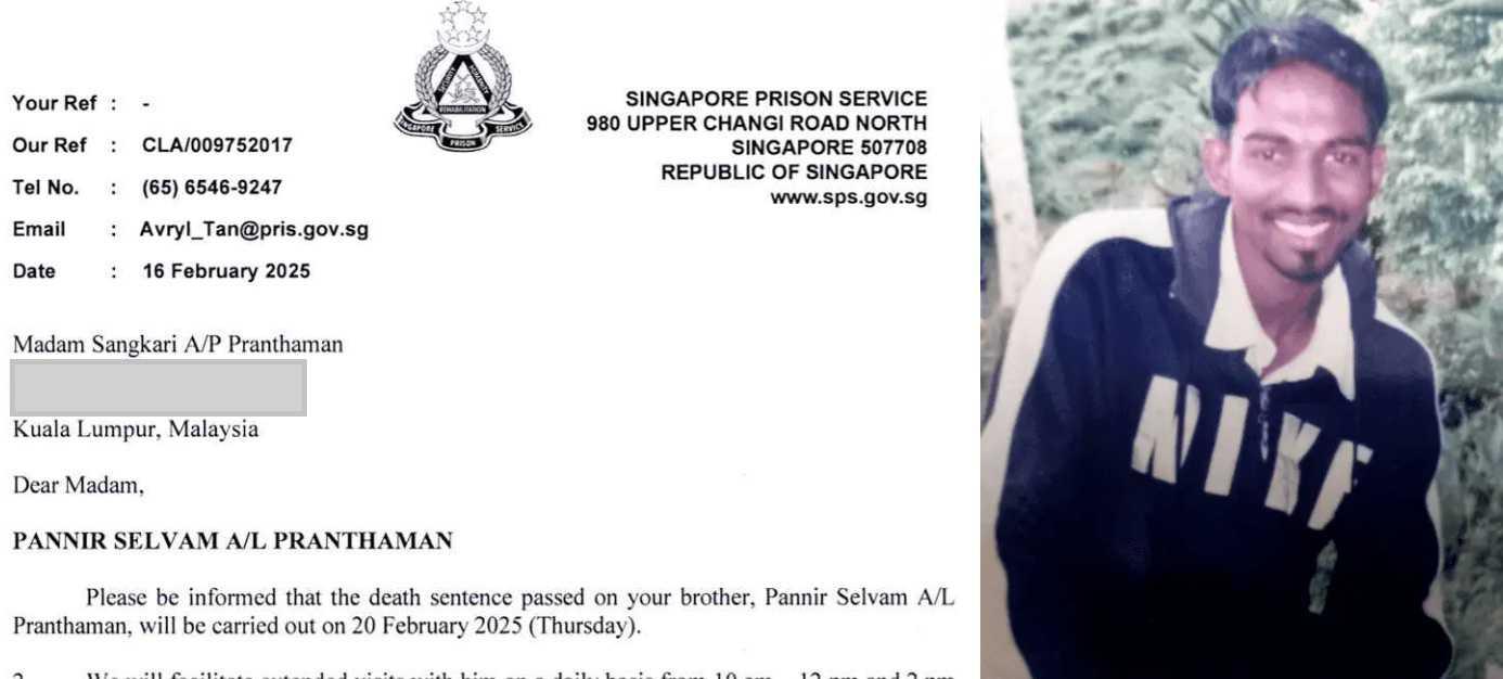 In a letter to his sister Sangkari Pranthaman, the Singapore Prison Service (SPS) said that her brother would be executed on Feb 20 and that the family would be granted additional visiting hours until then.