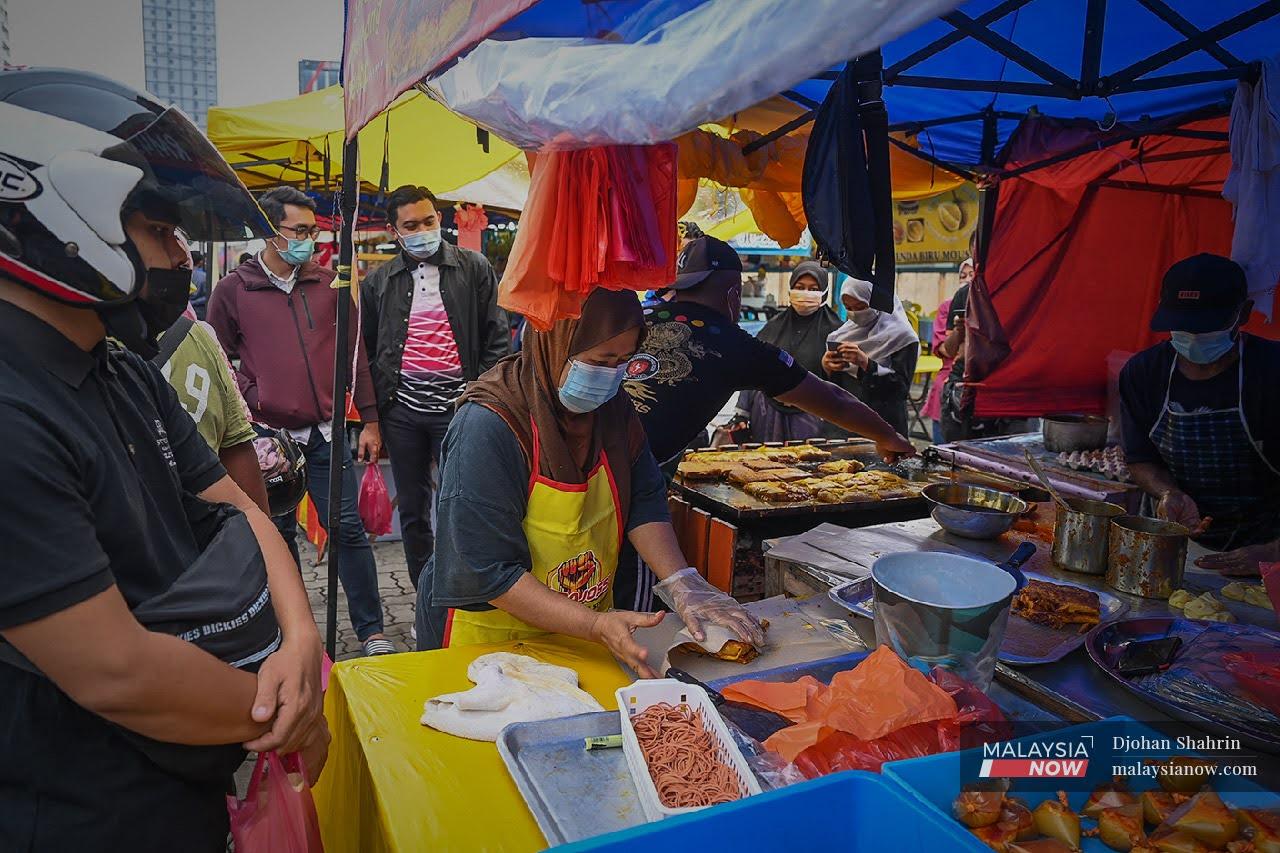 Food hawkers have to depend on the patronage of their customers and the quantity they buy. For customers, even if they overestimate the quantity that their family members are going to consume, they will be held back by how much they are going to spend on the berbuka puasa (breaking of fast). However, the food hawker will have no option but to hope for good business despite stiff competition from neighbouring food stalls.