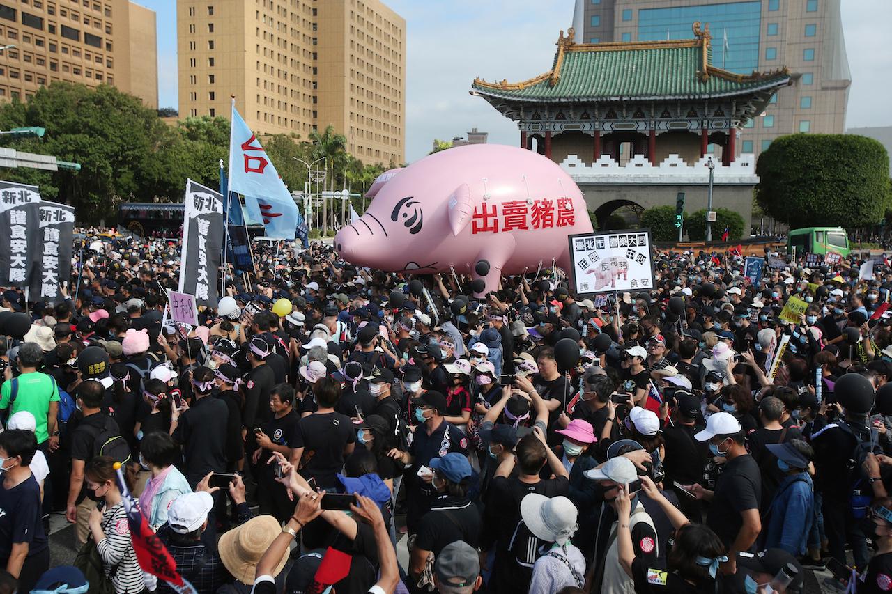 In the annual “Autumn Struggle” protest march, Taiwan’s main opposition party, the Kuomintang (KMT), rallied its supporters to join an increasingly vociferous campaign against the pork decision, which it says threatens the nation’s food safety.