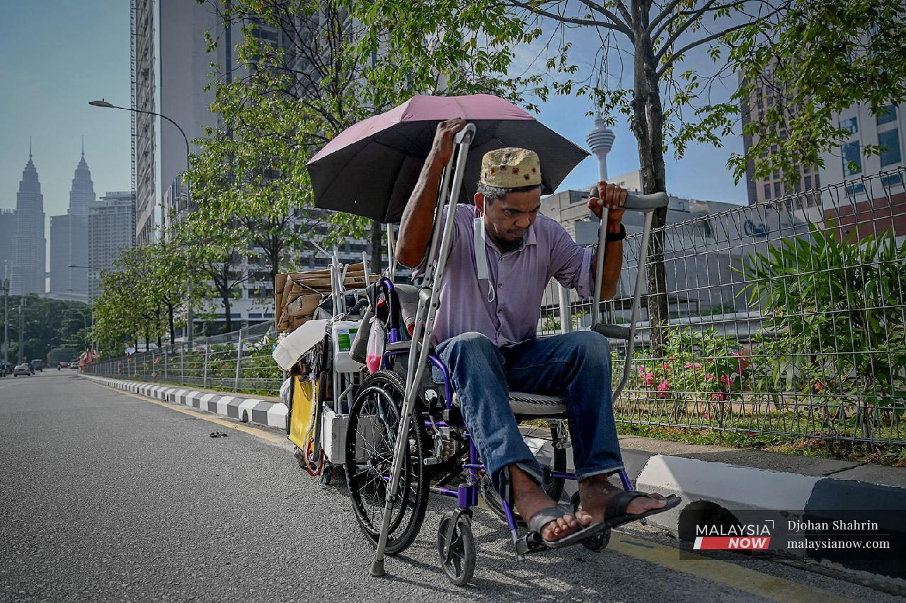 Affendi Mohamad used to earn a living as a contract worker but a workplace accident last year has left him wheelchair-bound, digging through the city's garbage for recyclables to sell to make ends meet.