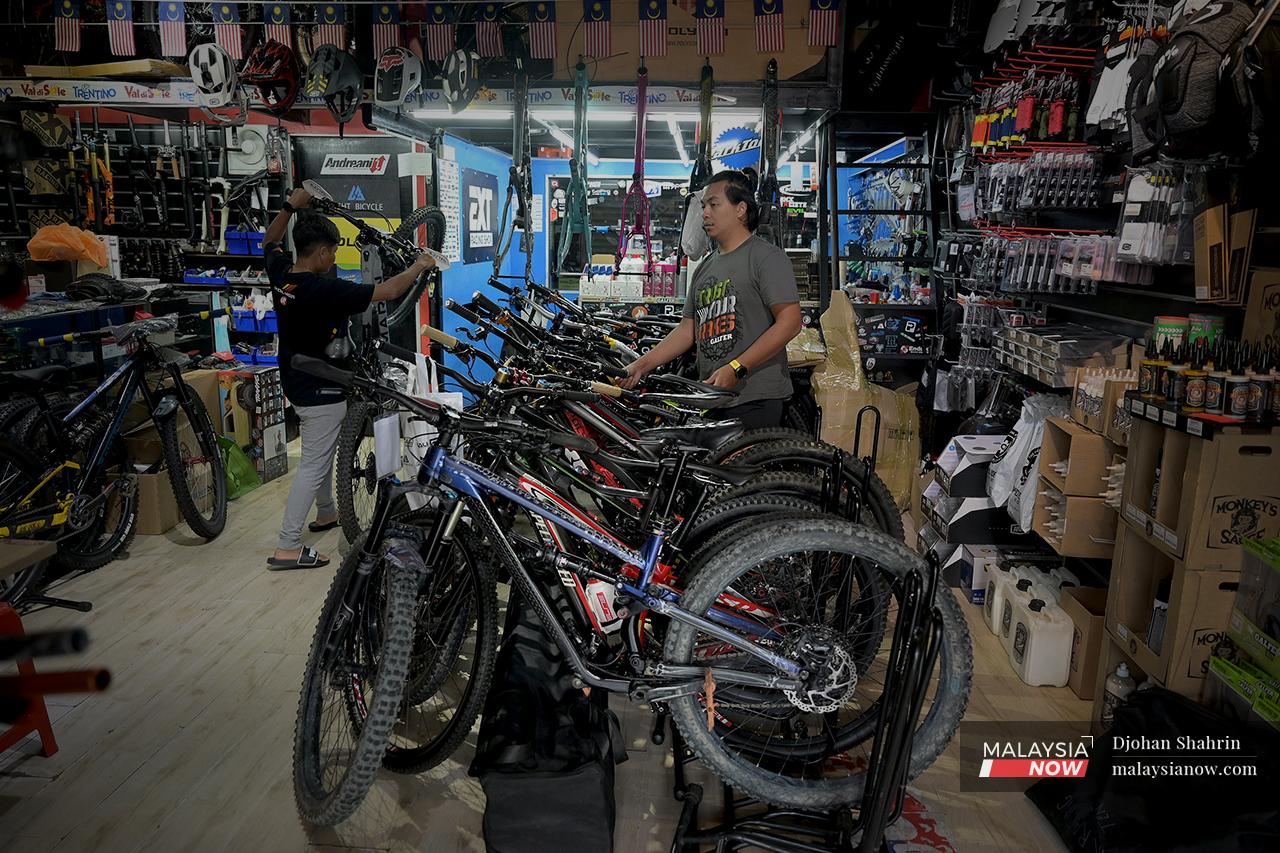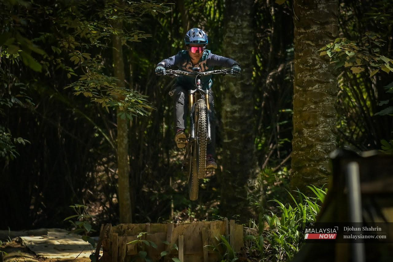Mountain bikers speed through tricky terrain that tests riders and bicycles alike.
